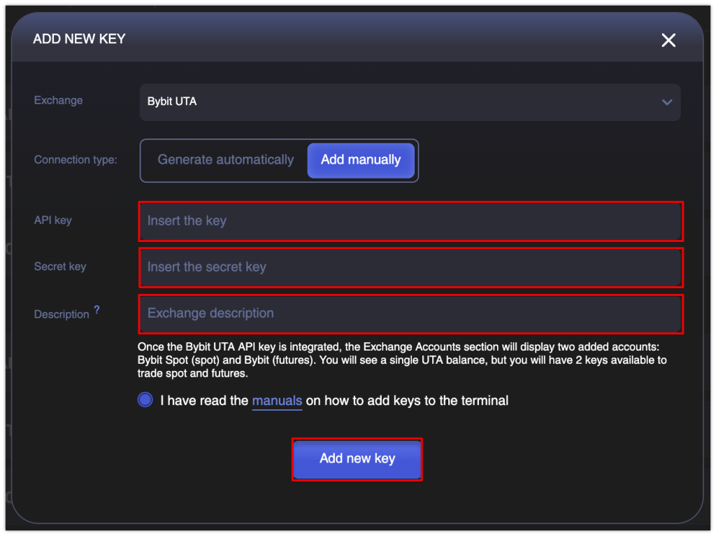 After integrating the API key from Bybit UTA exchange, you will see two added accounts in the Exchange Accounts section: Bybit Spot (spot) and Bybit (futures). You will see a single UTA balance, but you will have 2 keys available to trade spot and futures.